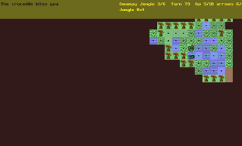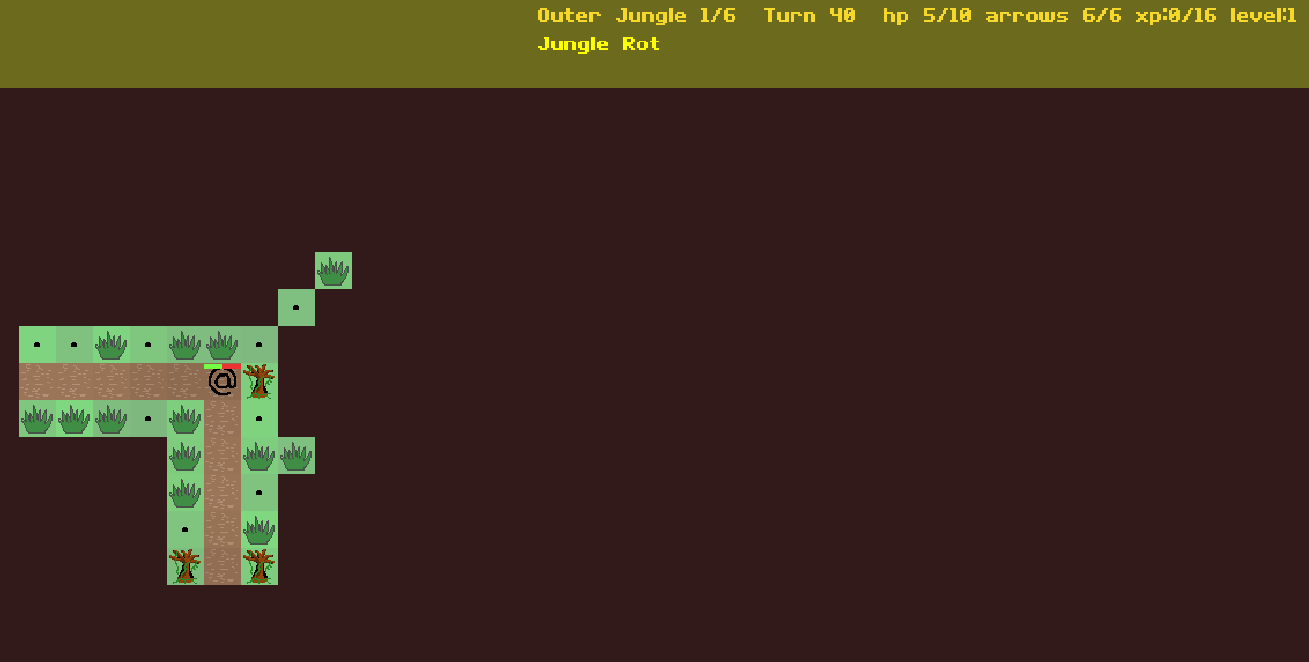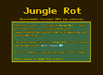 There are six differently themed jungle levels that generally have different threats. You start with 10hp max, and the maximum drops by 1 every 100 turns, so you have about 1000 turns to find the cure.